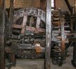 Ancient coin pressing machinery dating back to the mid-1700s, and imported from — of all places — Philadelphia. The spoked wheels all turn together, and force the turning of a central spindle that drops down to the floor below and presses the coin.
