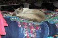 A partially-crippled Siamese rests atop a stack of hand-woven comforters